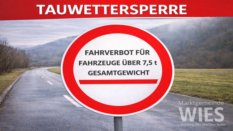Aufgrund der aktuellen Witterungsverhältnisse wird für alle Gemeindestraßen im Gemeindegebiet Wies eine Tauwettersperre verhängt.