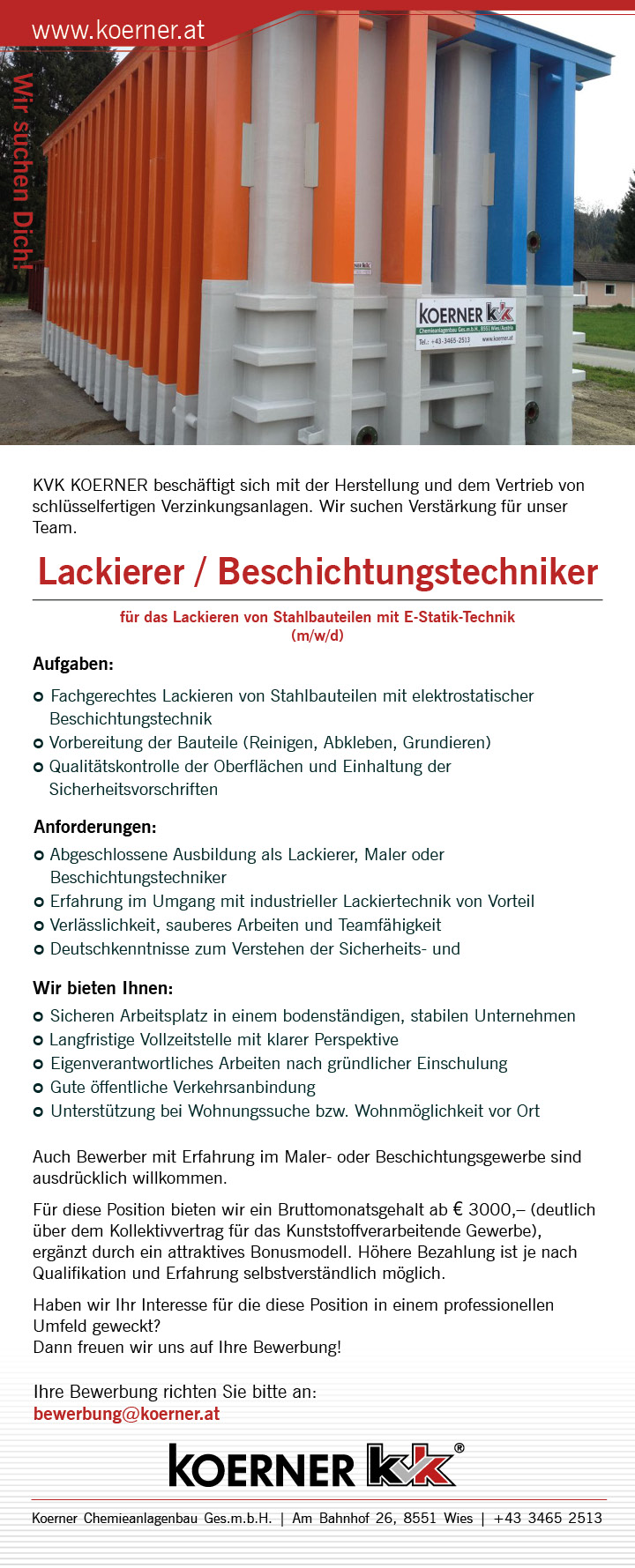 Stellenausschreibung - Körner Chemieanlagenbau – LackiererIn / BeschichtungstechnickerIn (JPG., 419 KB)